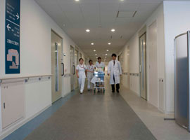 病室は各部屋の大きさを広めに取ると同時に、半数を個室にしています。快適な療養環境の追及を目指して、2階の急性期病棟は寒色系、3階の療養病床は暖色系を基調として各部屋ごとに部屋のしつらえやに床頭台などを変えるような工夫も行っています。また各部屋にインターネット回線が完備しています。※1